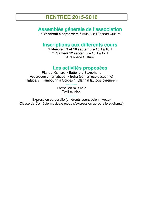 Rentrée 2015: Inscription les Mercredis 9 et 16 (15h à 18h) et Samedi 12 Septembre (10h à 12h) à l'Espace Culture....